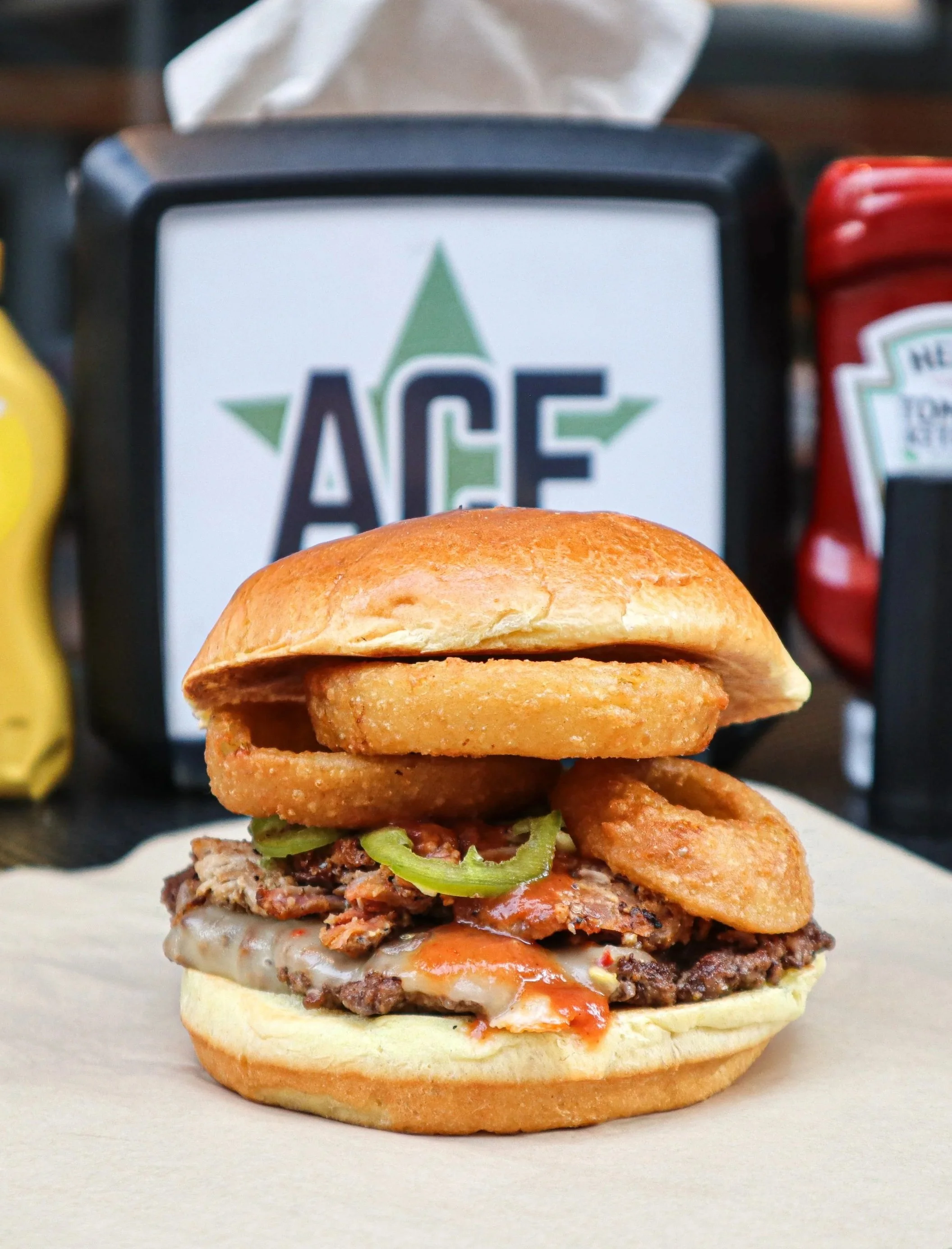 • Order the Bronico Burger (one fresh 1/4lb patty, pulled pork, Bronico BBQ sauce, one slice Pepperjack, onion rings, pickled jalapeños)